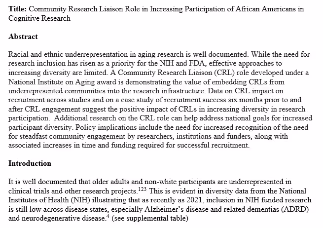 Sharon Brangman, Kathy Royal, Colleen Dillenbeck, Sarah McNamara, Nancy Smith, Eve De Rosa, Adam Anderson, and Elizabeth Riley. Community Research Liaison (CRL) Role in Increasing Participation of African Americans in Cognitive Research: A Case Study. Alzheimer's Dement., 19: e062941. https://doi.org/10.1002/alz.062941