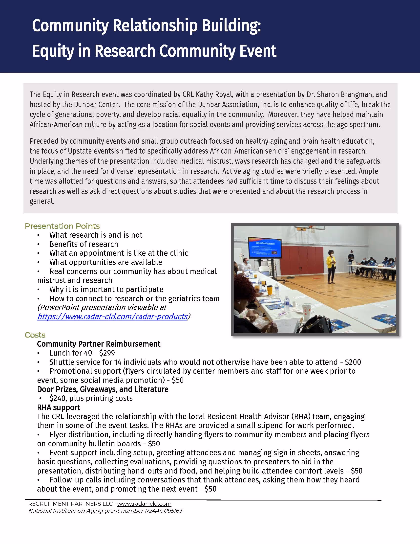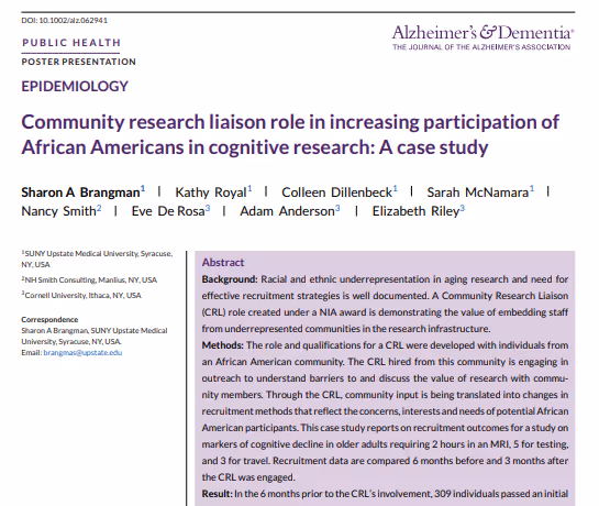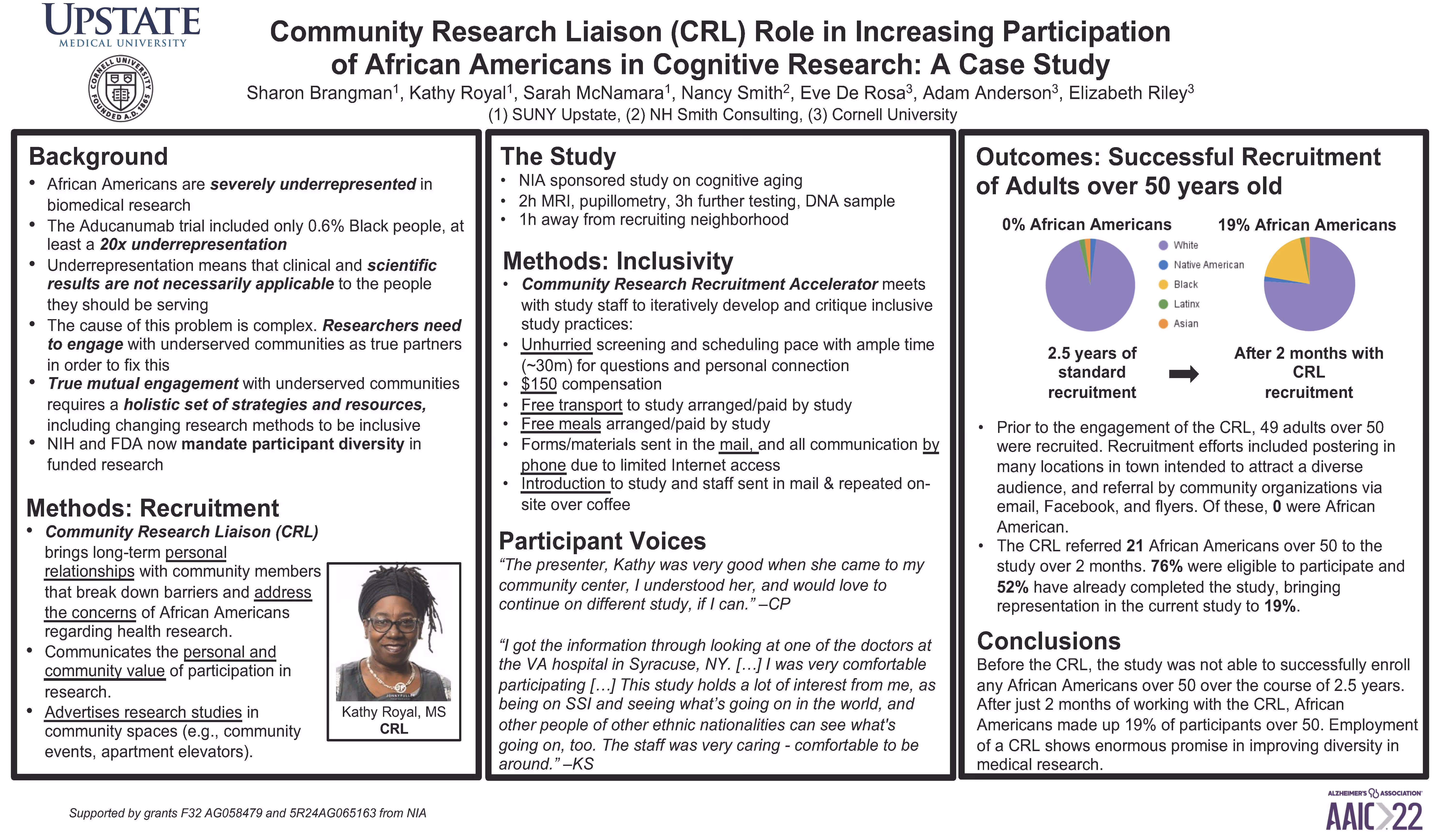 Sharon Brangman, Kathy Royal, Sarah McNamara, Nancy Smith, Eve De Rosa, Adam Anderson, and Elizabeth Riley. Community Research Liaison (CRL) Role in Increasing Participation of African Americans in Cognitive Research: A Case Study. AAIC 2022, San Diego, CA.
