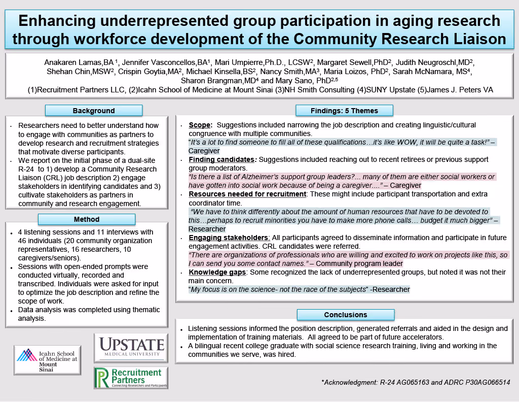 Anakaren Lamas, Jennifer Vasconcellos, Mari Umpierre, Margaret Sewell, Judith A Neugroschl, Shehan Chin, Crispin Goytia, Michael T Kinsella, Nancy Smith, Maria Loizos, Sarah McNamara, Sharon Brangman, Mary Sano. (2021), Enhancing underrepresented group participation in aging research through workforce development of the Community Research Liaison. Alzheimer's Dement., 17: e054561. https://doi.org/10.1002/alz.054561