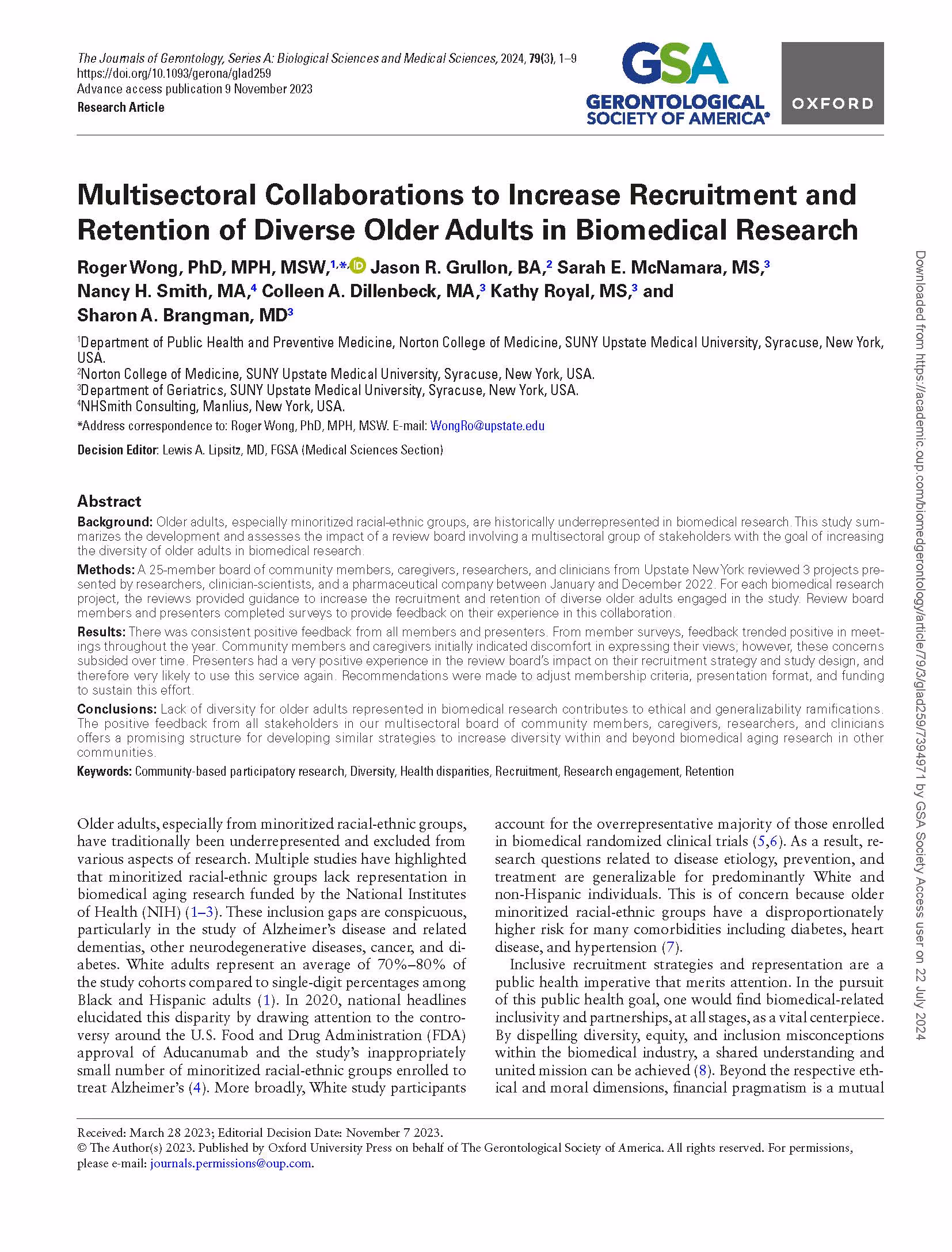 Roger Wong, Jason R Grullon, Sarah E McNamara, Nancy H Smith, Colleen A Dillenbeck, Kathy Royal, Sharon A Brangman (2024). Multisectoral Collaborations to Increase Recruitment and Retention of Diverse Older Adults in Biomedical Research. The Journals of Gerontology. Series A, Biological Sciences and Medical Sciences, 79(3), glad259. https://doi.org/10.1093/gerona/glad259